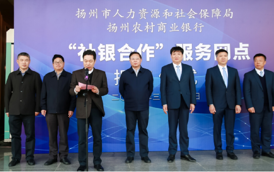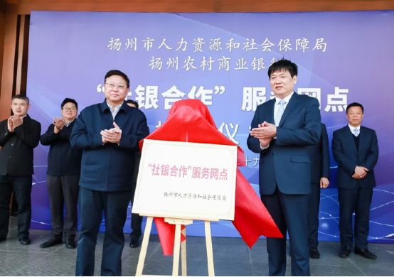 为贯彻落实中央“放管服”改革纵深推进的工作要求,发挥党建联建共建的示范引领作用,依托社银合作共同探索创新便民服务体系建设的新模式、新路径,协力促进群众服务满意度不断提升,3月29日上午扬州市人力资源和社会保障局“社银合作”服务网点在扬州农商银行总行营业部正式揭牌。市委组织部副部长、市人社局党委书记、局长范耘,扬州农商银行党委书记、董事长臧正志等双方领导参加揭牌仪式。